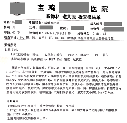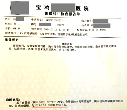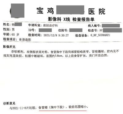 用藥前患者病理檢查確診為食管癌(鱗狀細胞癌),沒有手術指征,無法進行手術。隨后開始聯合放化療使用注射用綠原酸,完成9次化療后,開始單獨使用注射用綠原酸至今。用藥20天影像學檢查顯示病灶范圍較前縮小;用藥2年7個月復查,顯示食管管腔較前變化不大;聯合用藥期間,放化療基本沒有副作用。患者用藥至今,不影響外出旅游,病情穩定向好,無復發和轉移跡象,血生化指標正常,生活狀態良好。